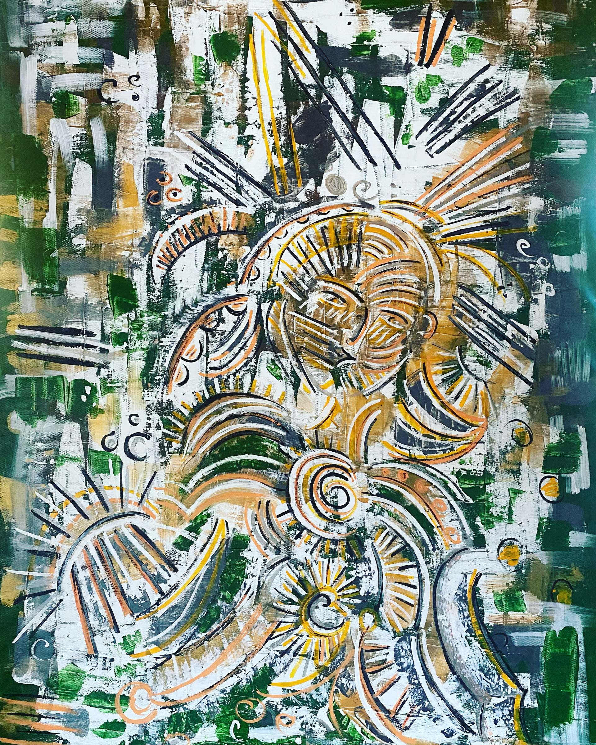 Die kraftvollen Linien und leuchtenden Farben erzählen von Veränderung, Wachstum und der ständigen Bewegung des Lebens.